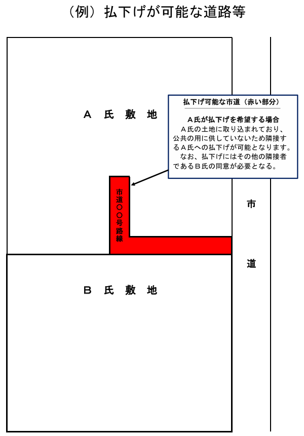 払下げ(はらいさげ)とは、自治体が所有する公共の土地や財産を、隣接する個人や法人などに有償で売却・譲渡する手続きのこと。土地の有効活用や分断解消のために行われ、おもに使われなくなった里道や水路など(法定外公共物という)が対象となる。市道の払下げも可能である。