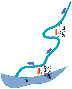 捷水路 X Facebook はてブ LINE コピー 2025.11.16 捷水路(しょうすいろ)は、河川が大きく曲がりくねって水の流れにくい部分をまっすぐに付け替えた水路(河川)のこと。短絡水路やショートカットともいう。 国交省Webサイトより 関連ブログ記事:河川の分類と管理区間 関連用語:水系 流域 本川 支川 派川 放水路 土木行政用語辞典 ホームに戻る